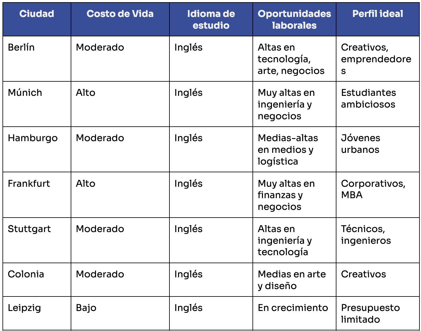 Alemania no solo es un destino educativo de primer nivel, sino también un país diverso y lleno de oportunidades. Desde la vibrante Berlín hasta la creativa Colonia o la accesible Leipzig, hay una ciudad ideal para ti, dependiendo de tu carrera, estilo de vida y presupuesto.